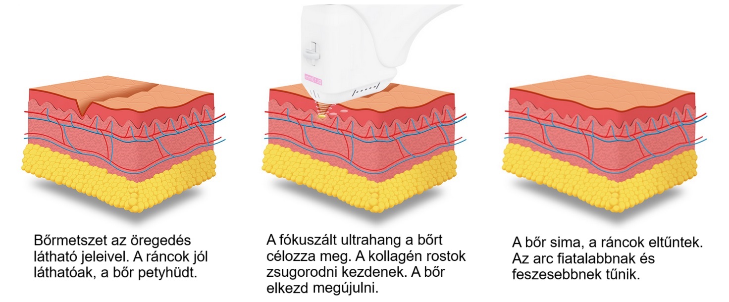 Intenzív, fókuszált ultrahang éri el a szövetet. A fókuszált ultrahangsugár gyulladásos pontokat hoz létre. A kollagén rostok zsugorodni kezdenek. A testzsír elkezd metabolizálódni és eltávolítani. Elindul az új bőr újjáépítésének folyamata.