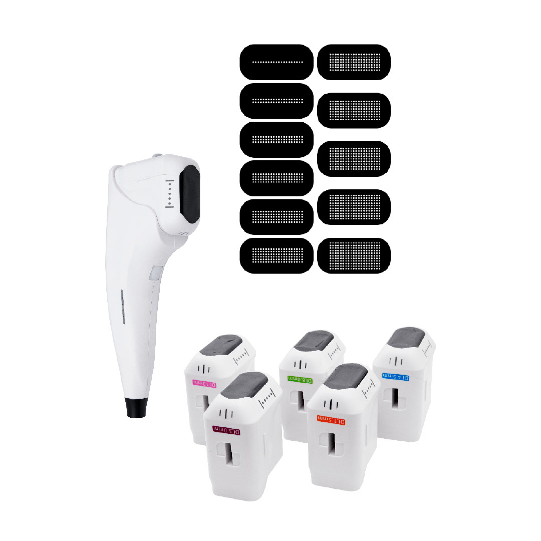 – 5 db patronból álló készlet. Az 1,5 mm-es, 3,0 mm-es, 4,5 mm-es, 8,0 mm-es, 13,0 mm-es patronok lehetővé teszik bőrfiatalító kezelések, valamint testzsír-csökkentő kezelések elvégzését