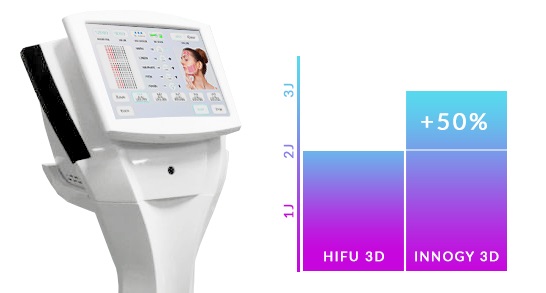 A HIFU 3D Innogy jobb eredmények elérését teszi lehetővé! 3 J energia akár 50%-kal több energia, mint bármely más HIFU 3D készülékben. Mostantól akár 13 mm-es mélységben is végezhet HIFU-kezeléseket, és akár 3 J erővel is. Jobb hatásokat érhet el kisebb sűrűségű felvételekkel. Meghosszabbítja az élettartamát és lehetővé teszi, hogy hosszabb ideig használja.